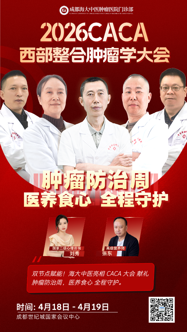 4月18日至19日,成都海大中医肿瘤医院门诊部的7位代表将出现在2026年CACA西部整合肿瘤学大会的现场,聆听前沿、交流实践、对接学术。